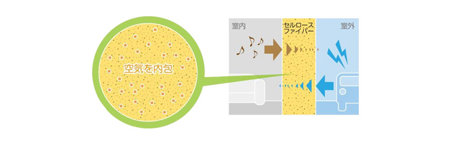 セルロースファイバーは、繊維1本1本に空気を含んでいます。 この厚い空気の層が音を吸収し、伝えにくくする性質を持っています。